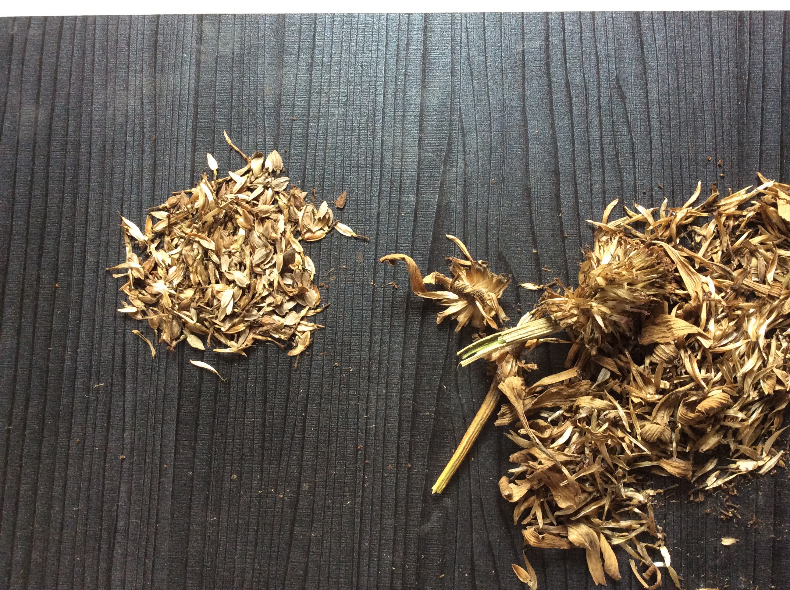 Sebelah kiri biji zinnia, sebelah kanan kelopak kering yang jadi sampah