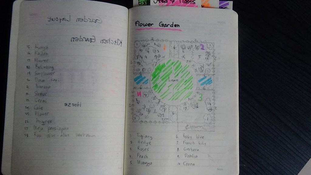 - Garden layout. Saya punya dua kebun: kebun sayur dan kebun bunga. Layout berisi bentuk kebun dan jenis-jenis tanaman yang saya tanam di kebun tersebut. Saya urutkan tanaman dengan angka berurut. Nama-nama tanaman saya tulis dengan menggunakan pensil. Tujuannya kalau sewaktu-waktu tanaman saya pindahkan, mati atau diganti bisa saya tuliskan kembali dengan tanman baru. Bagian ini juga adalah cara melawan lupa tanaman apa saja yang saya tanam.
