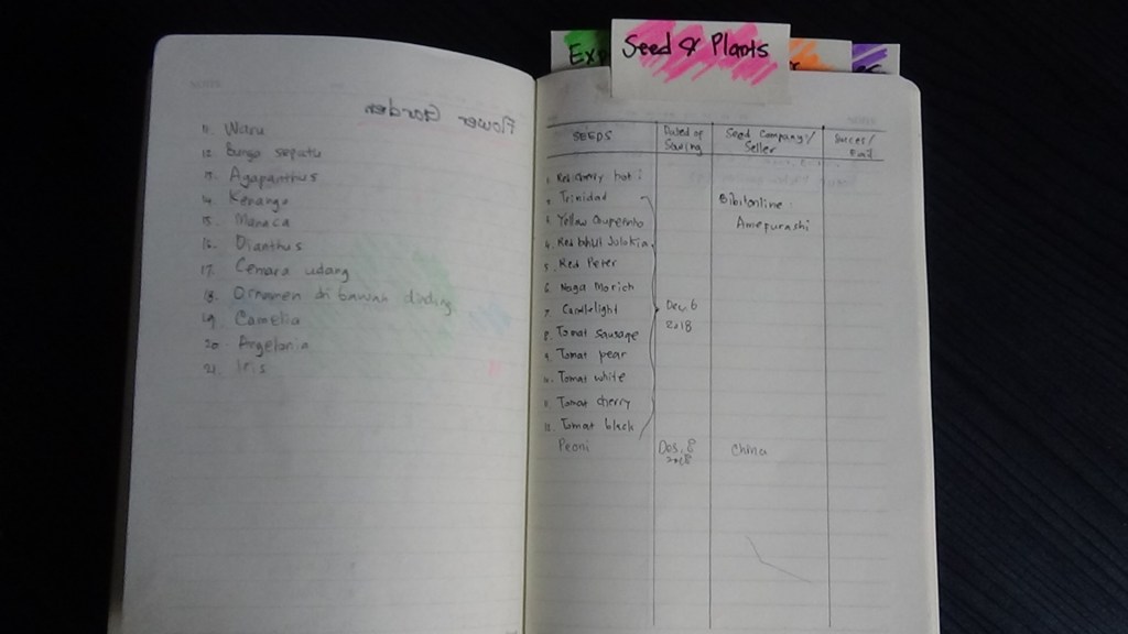 - Seed and plants. Bagian ini adalah daftar benih dan tanaman yang saya tanam. Untuk daftar benih tertulis nama benih, tanggal penyemaian, perusahan/pedagang benih dan keterangan apakah benih sukses disemai atau tidak. Dengan menuliskan semuanya saya bisa tahu berapa lama benih disemai sampai tumbuh serta pedagang mana yang menjual benih yang baik. Jadi kalau saya mau beli benih lagi saya bisa ada referensi benih yang baik. Sedangkan bagian plants dimaksudkan supaya saya tahu usia tanaman saya dan kapan saya bisa panen.